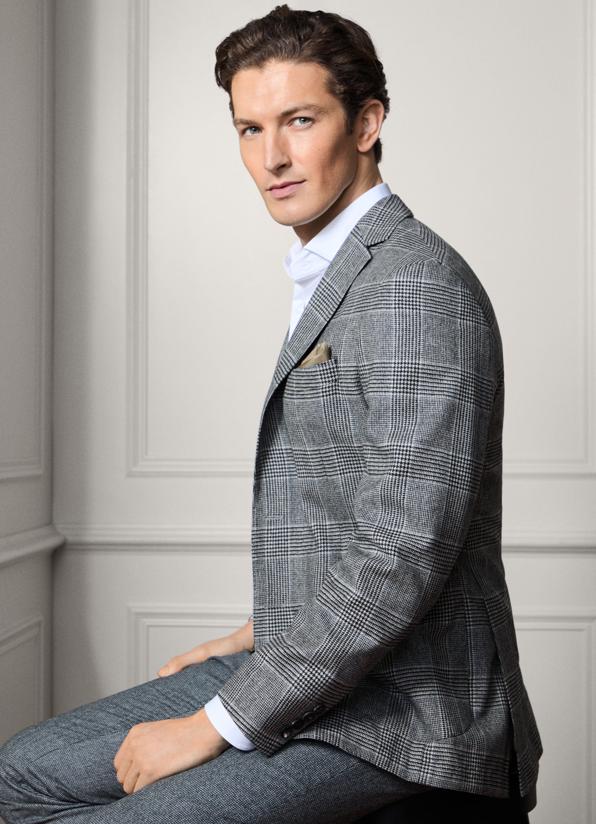 Dieser SB2-Reverskragen-Blazer verfügt über ein einfarbiges Glencheck-Muster in einer Wolle-Kaschmir-Mischung. Mit Hemdjacken-Konstruktion, weichem, gemahlenem Griff und echten Hornknöpfen wird er mit saisonalen Besätzen und einer Blumenöse vervollständigt.