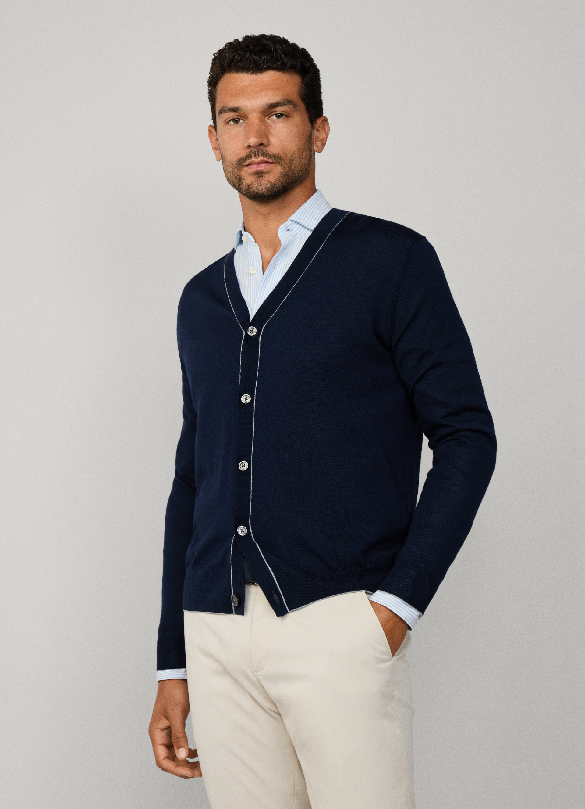 - Strickjacke aus Merinowolle und Seide, stückgefärbt, mit 'Hackett'-Markenknöpfen