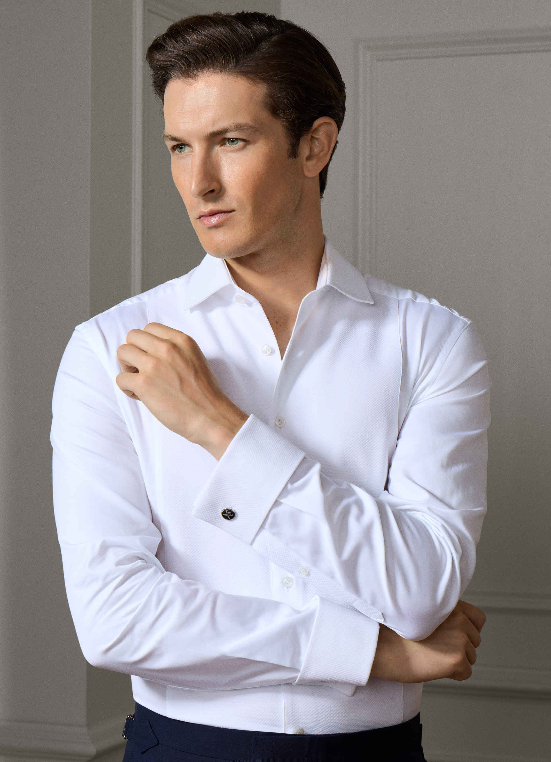 Formelles Hemd mit einem Knightsbridge-Kragen, französischer Knopfleiste und doppelten Manschetten. Mit dezent strukturiertem Latz und Manschettendetail. Tailored Fit für einen scharfen und eleganten formellen Look.