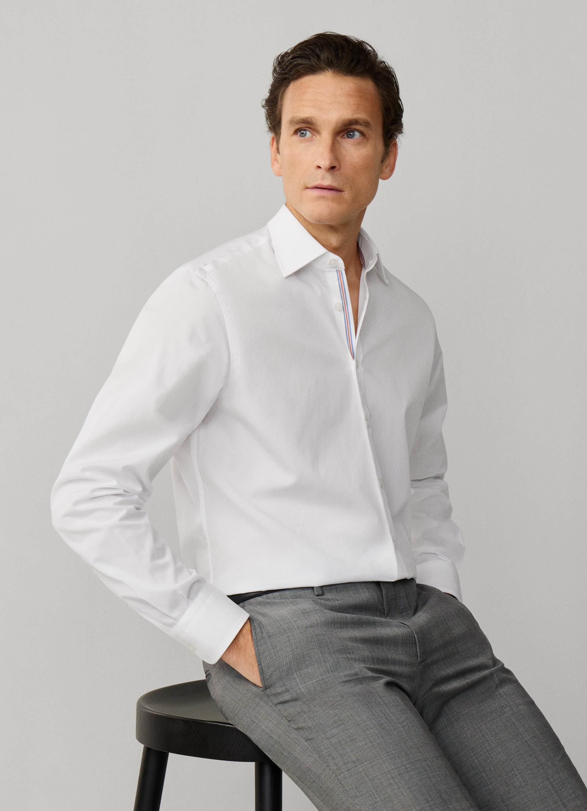 - Gestreiftes Detail an der inneren Manschette, am hinteren Nacken und unter der Knopfleiste