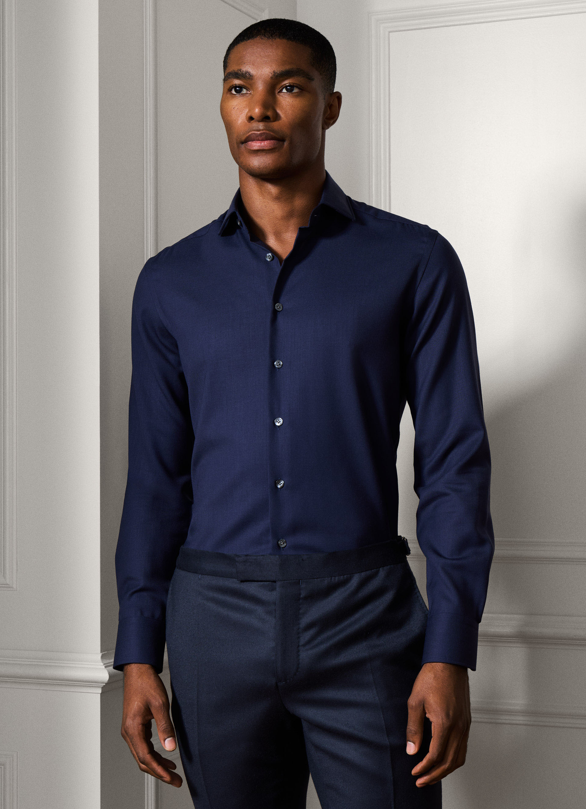 Hergestellt aus luxuriöser Merinowolle, bietet dieses maßgeschneiderte Hemd in sattem Marineblau einen weichen Griff und verfügt über den 'Knightsbridge' Cutaway-Kragen für einen gehobenen Stil.