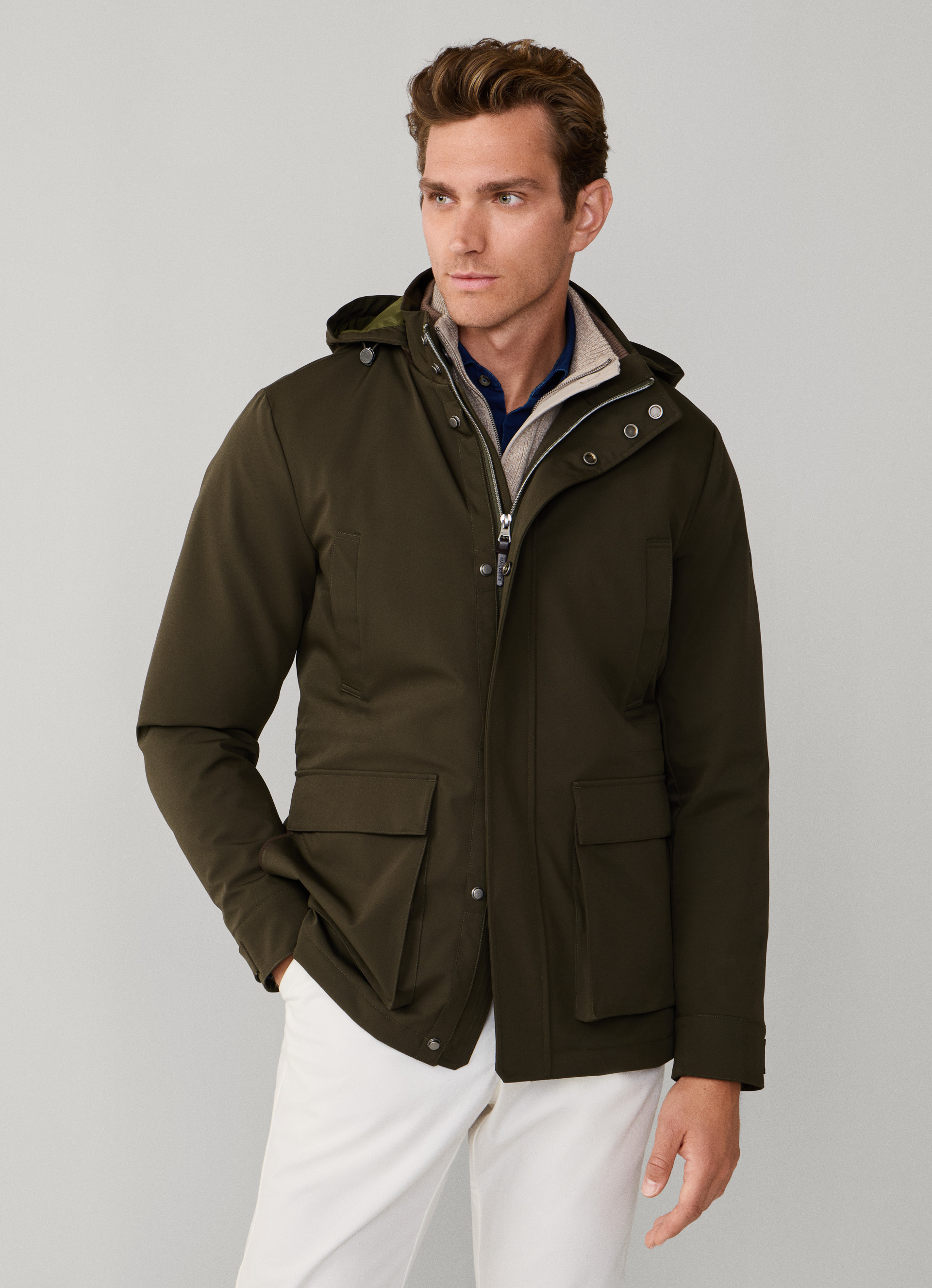 - Verdeckte Druckknöpfe, doppelter Reißverschluss und abnehmbare Kapuze