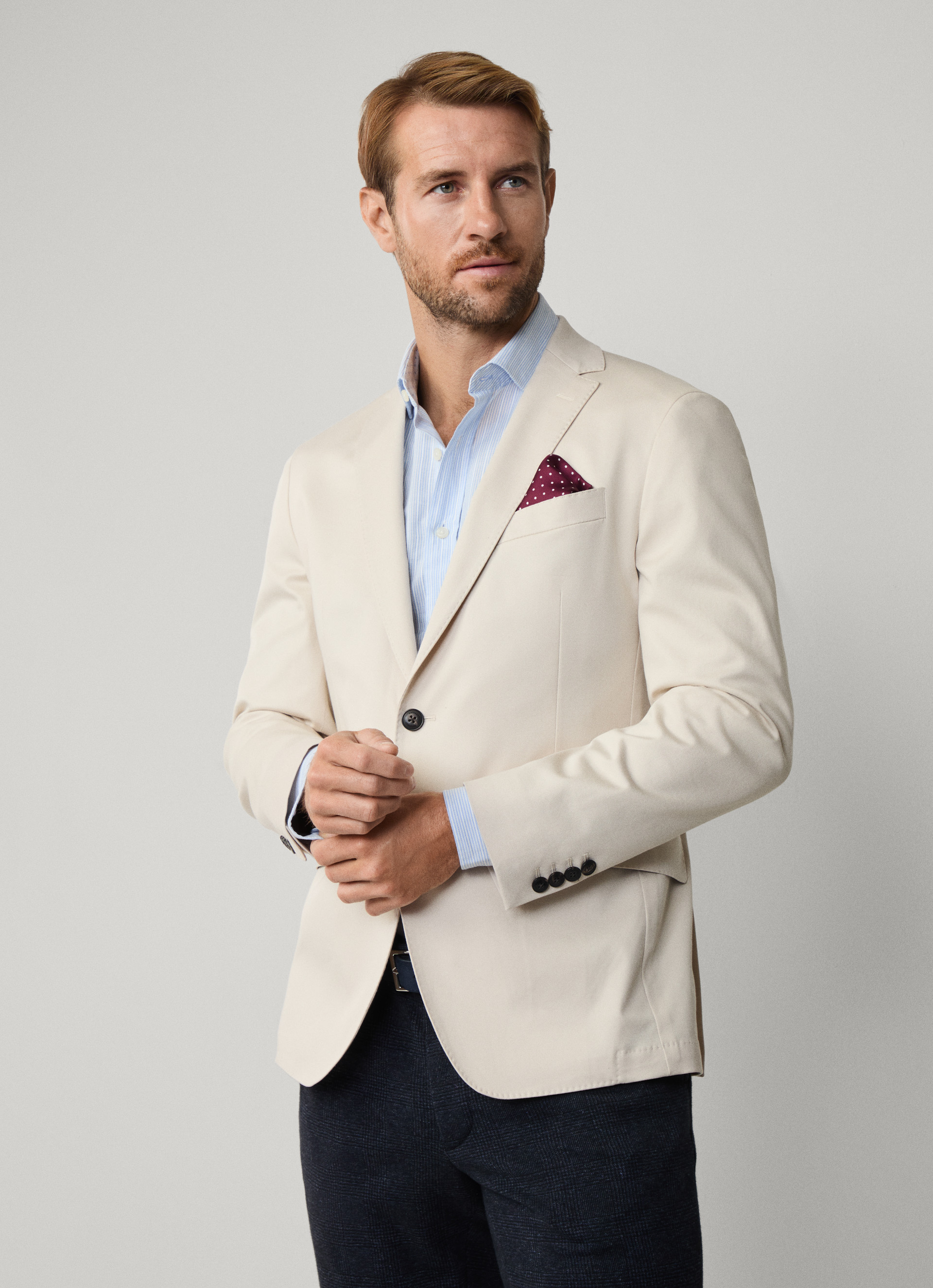 - Presenta cierre de dos botones, una solapa de muesca, puños abotonados y bolsillos con solapa para un corte atemporal