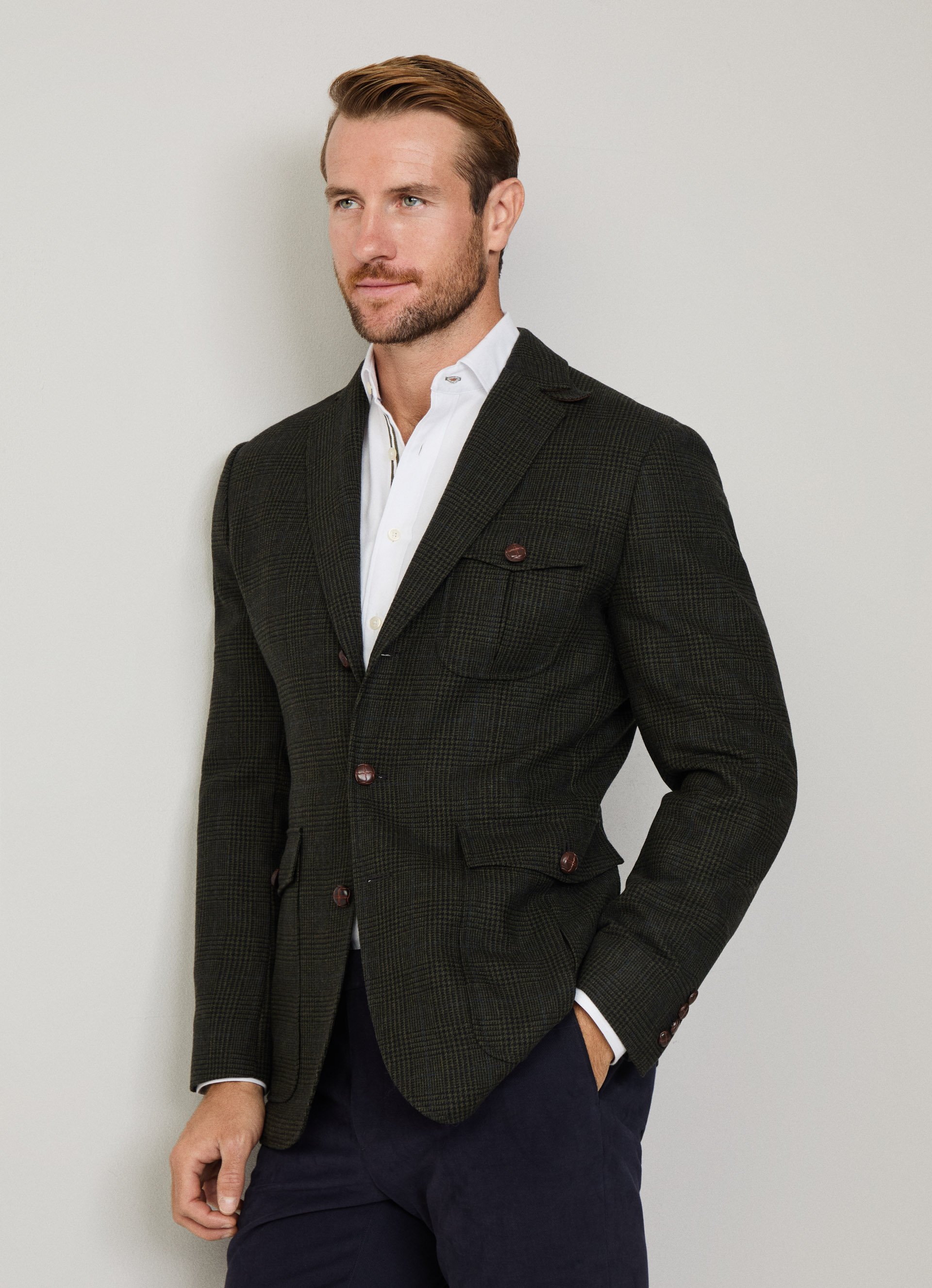 - Presenta cierre de tres botones, solapa de muesca, puños abotonados y bolsillos de parche