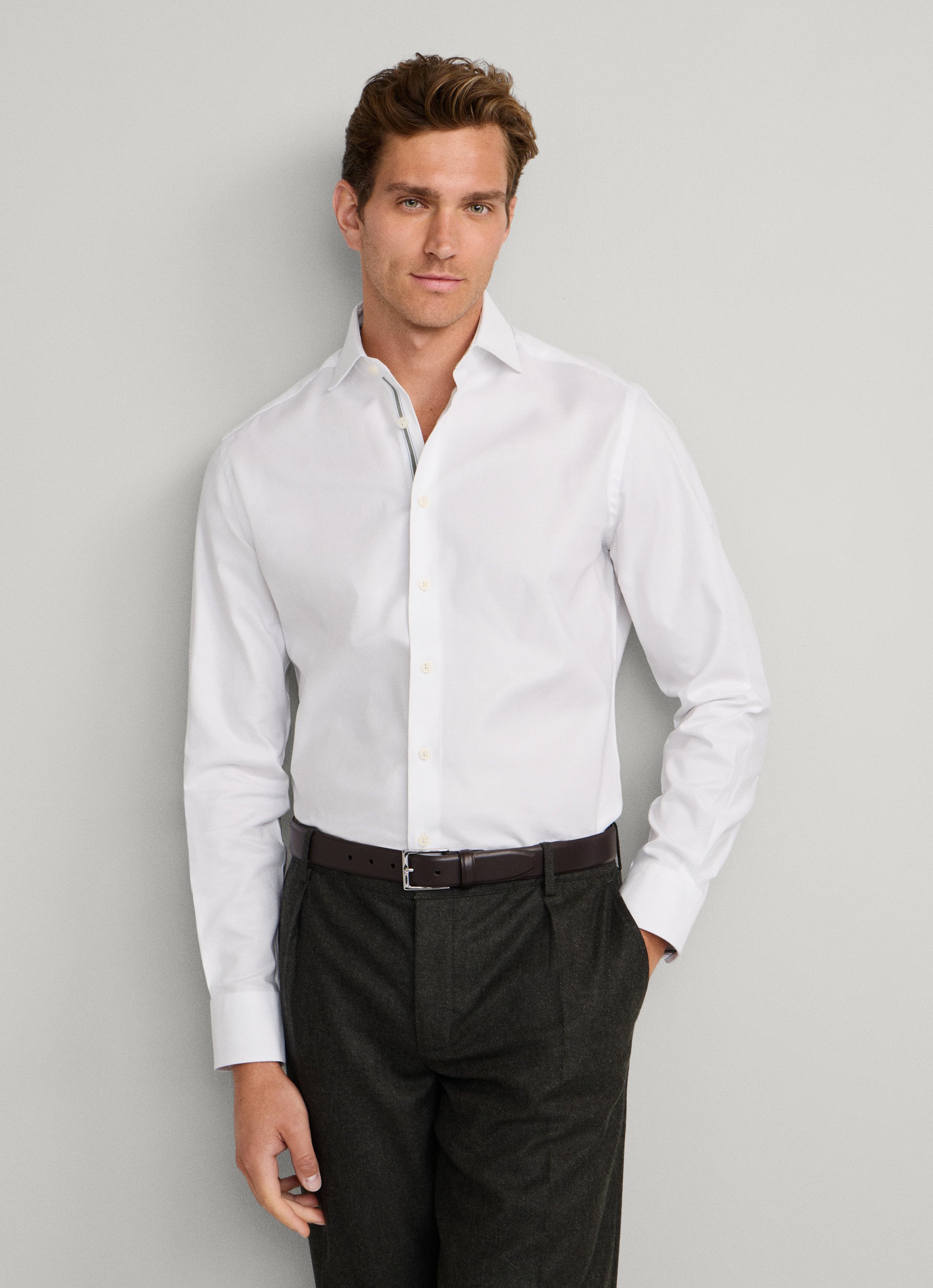 - Cuello Kent recortado, un sello distintivo de los estilos clásicos de las camisas Hackett