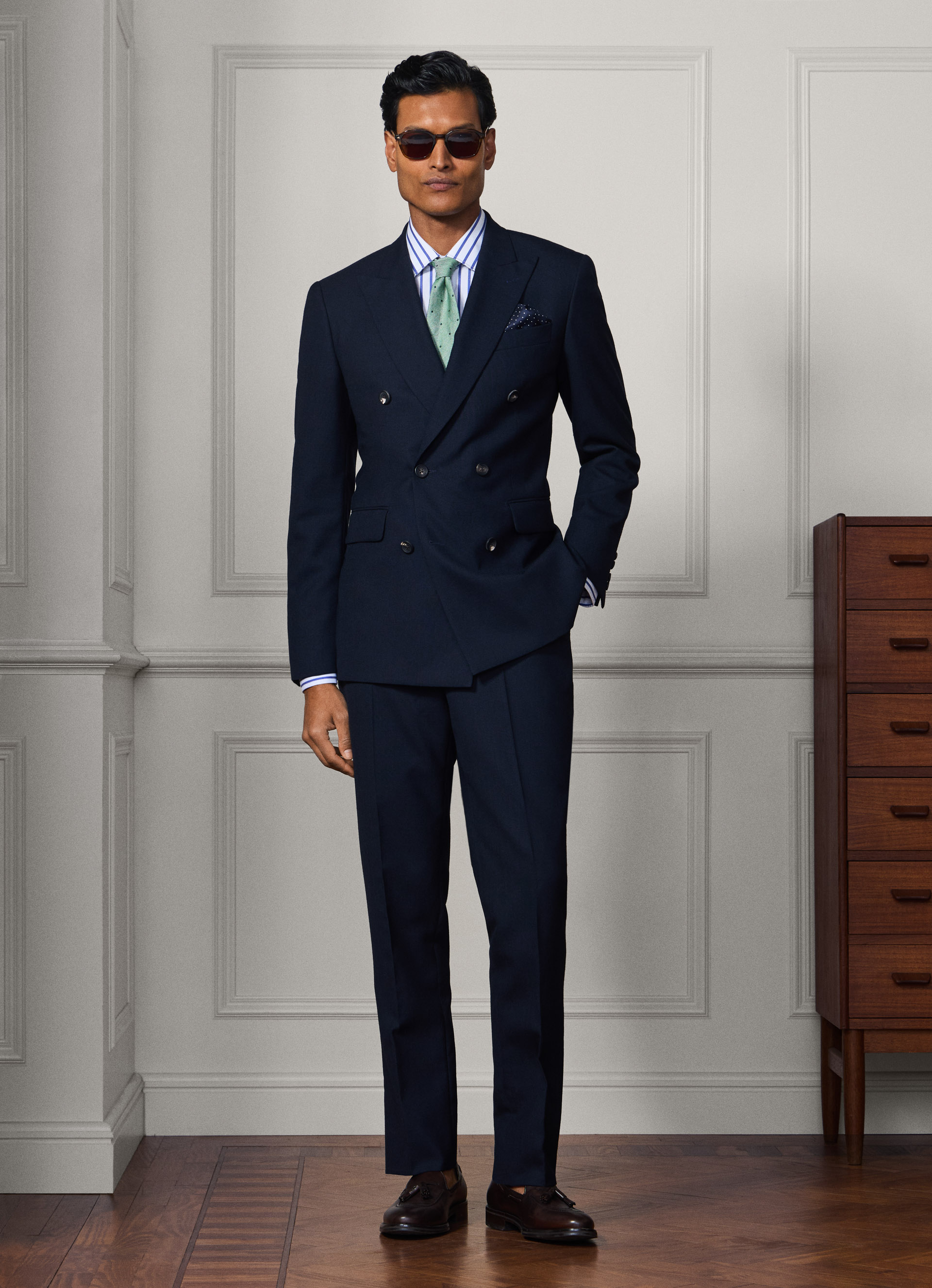 Tejido en Inglaterra por Dugdale a partir de lana Fresco 100%, este traje azul marino de doble botonadura combina comodidad transpirable con un corte impecable. La chaqueta está completamente forrada y acabada con bolsillos con solapa, botones de cuerno y un ojal para flores bajo la solapa, mientras que los pantalones de frente plano presentan bolsillos inclinados y ajustadores laterales. Los ribetes internos de temporada con detalles en bronce y azul cielo añaden un toque final refinado.
