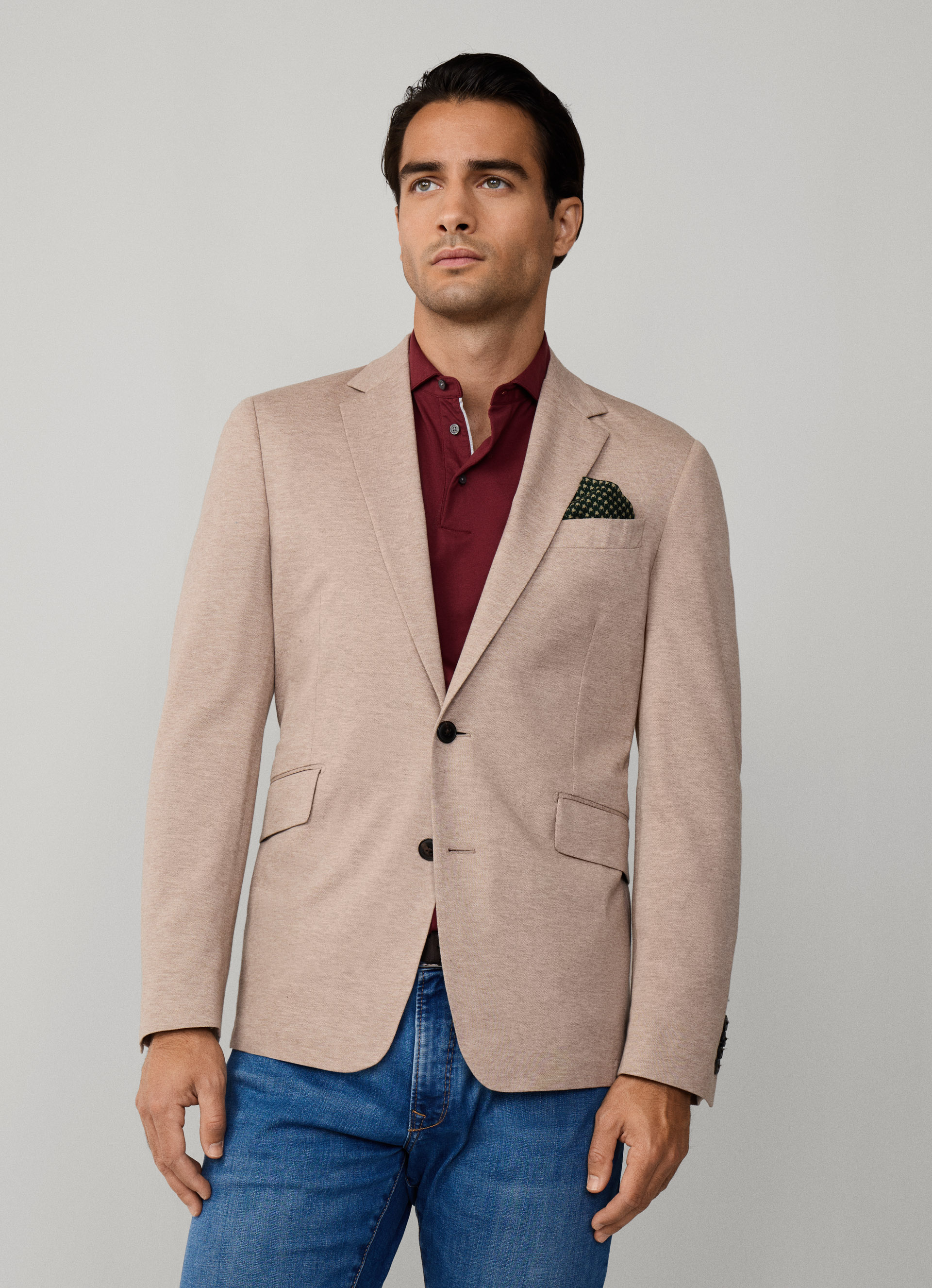 - Doté de deux boutons, d'un col à revers cranté, de poignets boutonnés et de poches à rabat