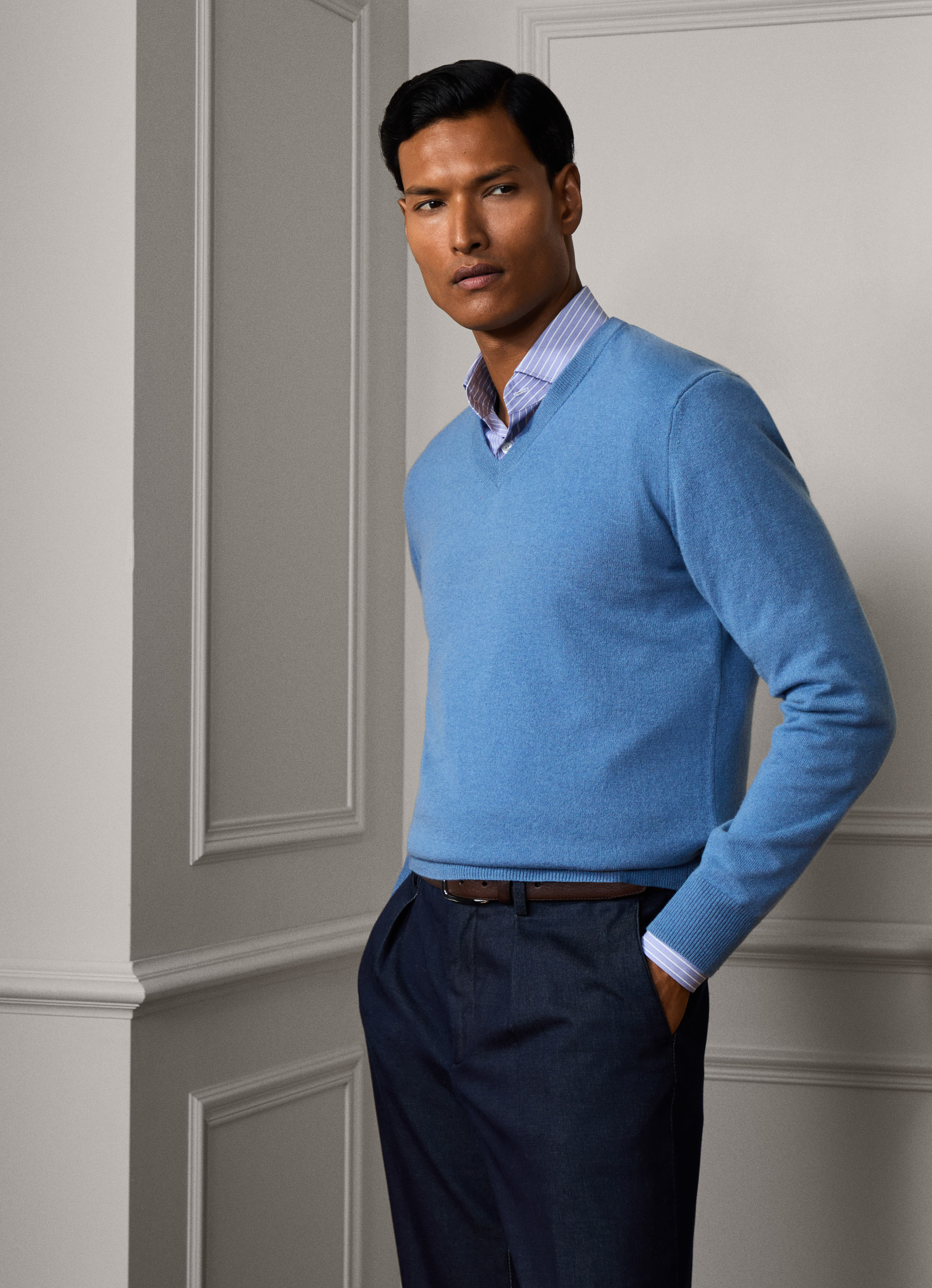 Notre pull col V distinctif en cachemire luxueux a été tricoté avec un fil très fin de 14g, créant un vêtement extrêmement doux. Convient pour la mi-saison et l'hiver.