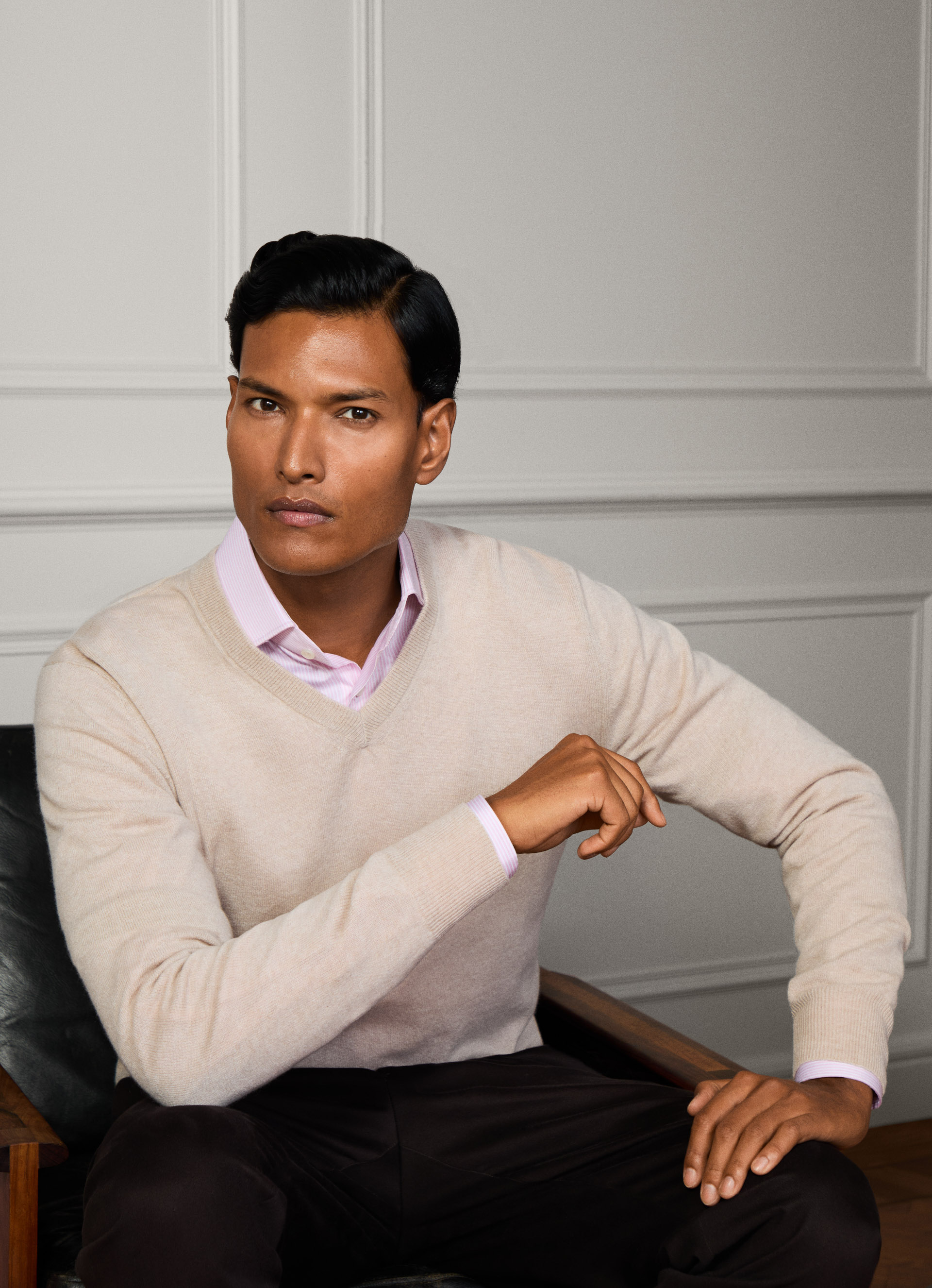 Notre pull col V distinctif en cachemire luxueux a été tricoté avec un fil très fin de 14g, créant un vêtement extrêmement doux. Convient pour la mi-saison et l'hiver.