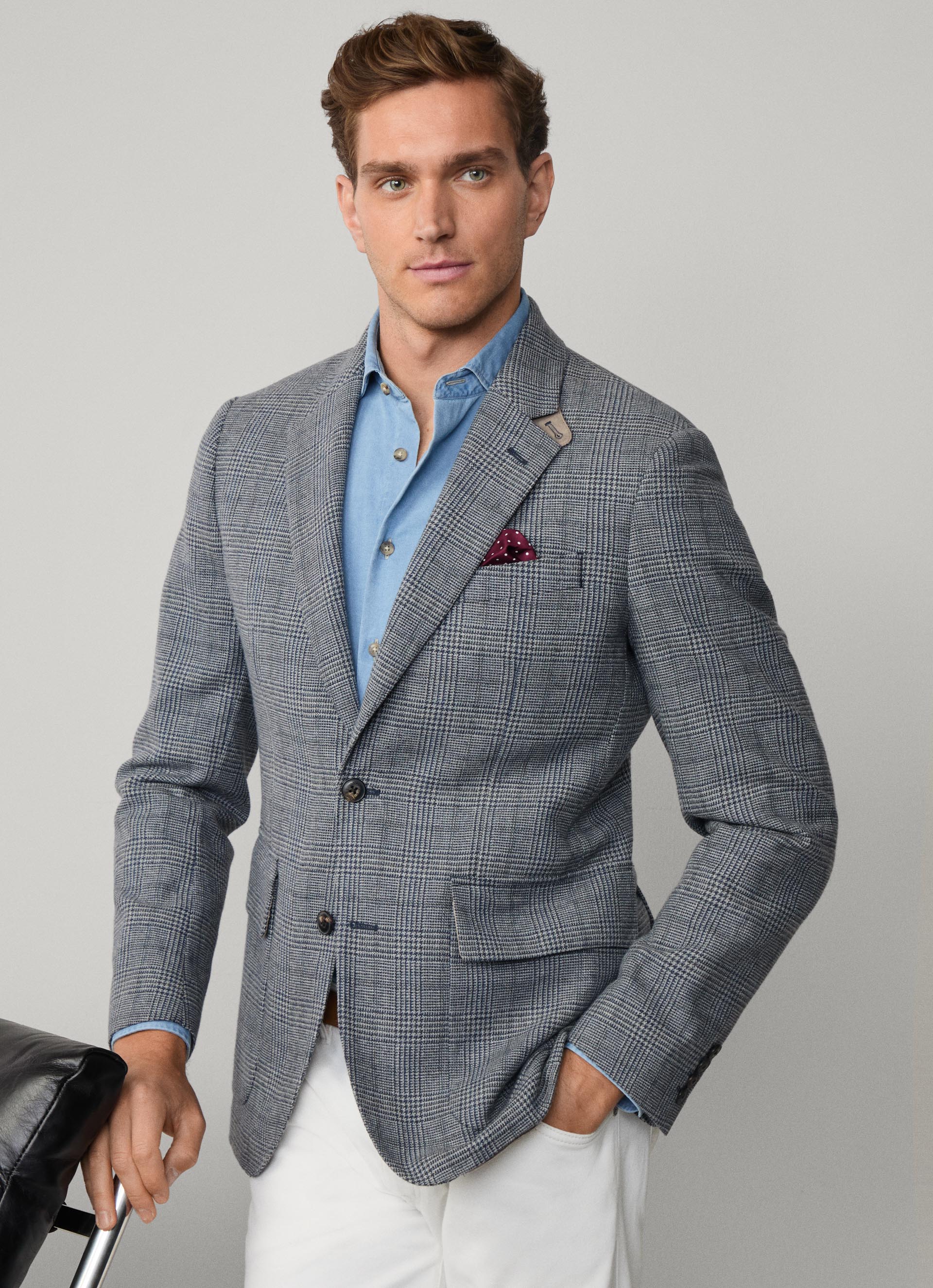 - Features two buttons, a notch lapel, button cuffs, and flap pockets