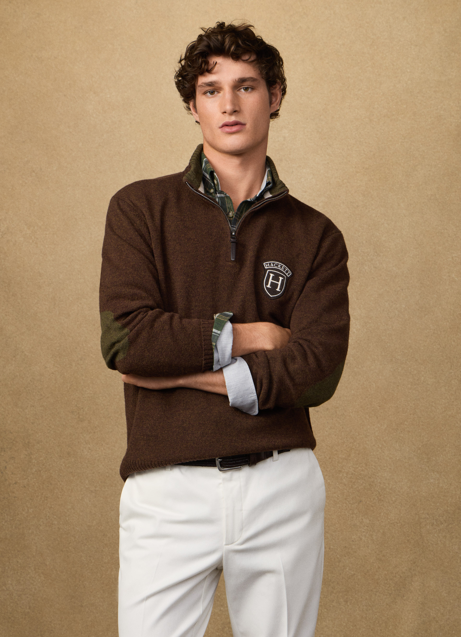 - Features a quarter-zip fastening, with a graphic appliqué badge on the chest and a contrast intarsia ‘H’ detail