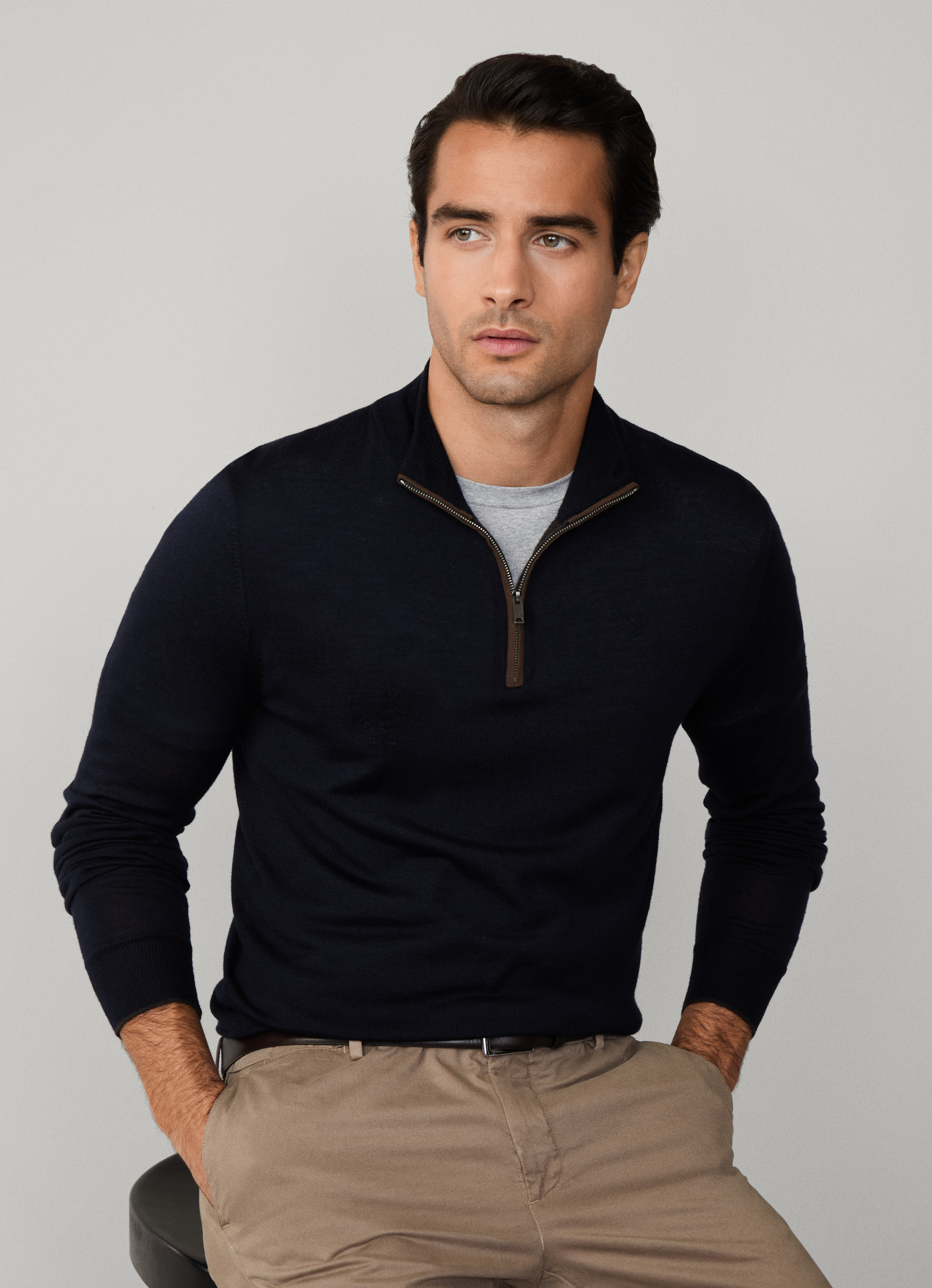 - Lightweight quarter zip jumper crafted in a merino wool and silk blend