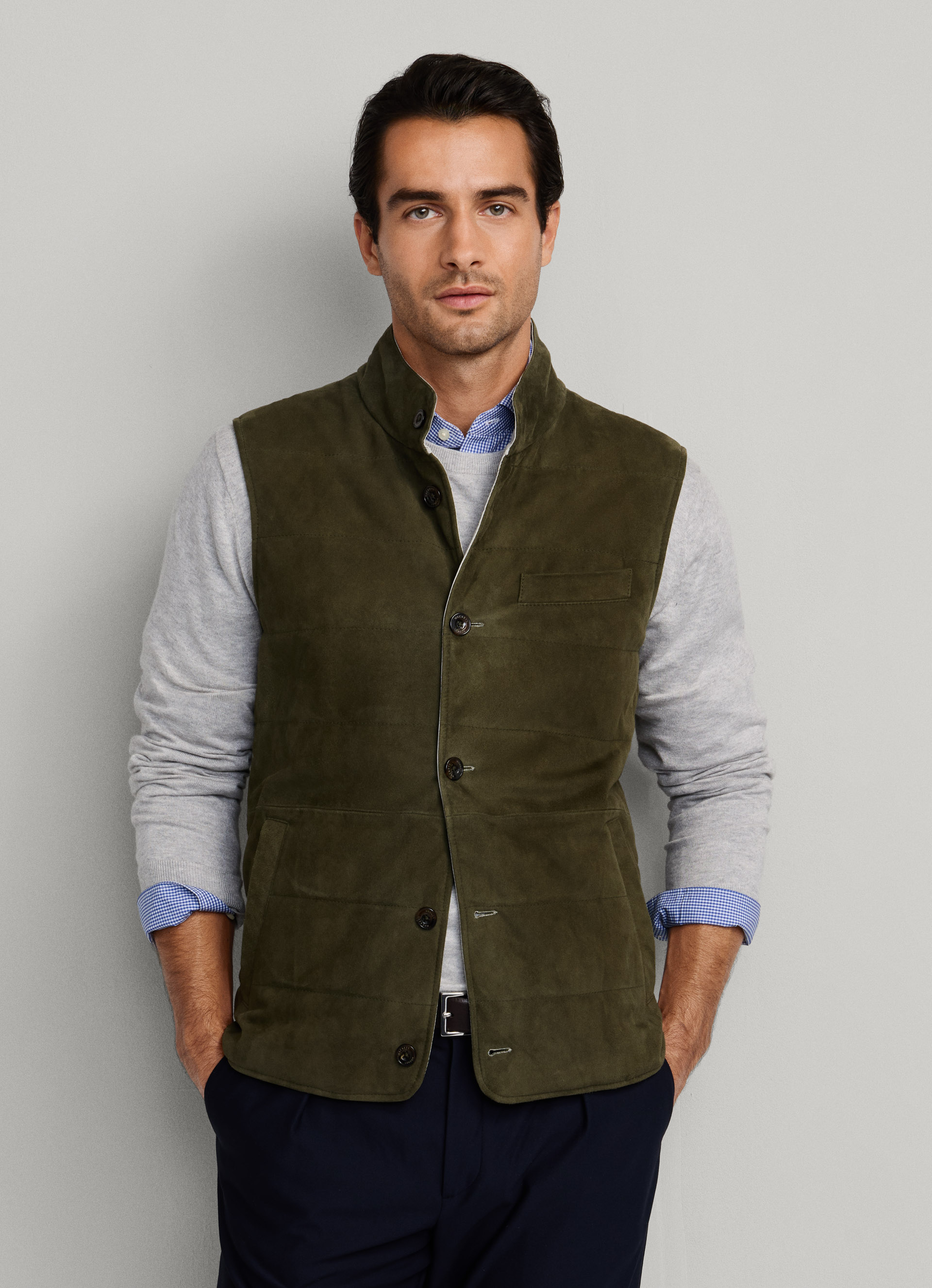 -Designed for versatile elegance, this reversible gilet offers the refined texture of soft suede on one side and a sophisticated, resilient woven finish on the other. See More Details