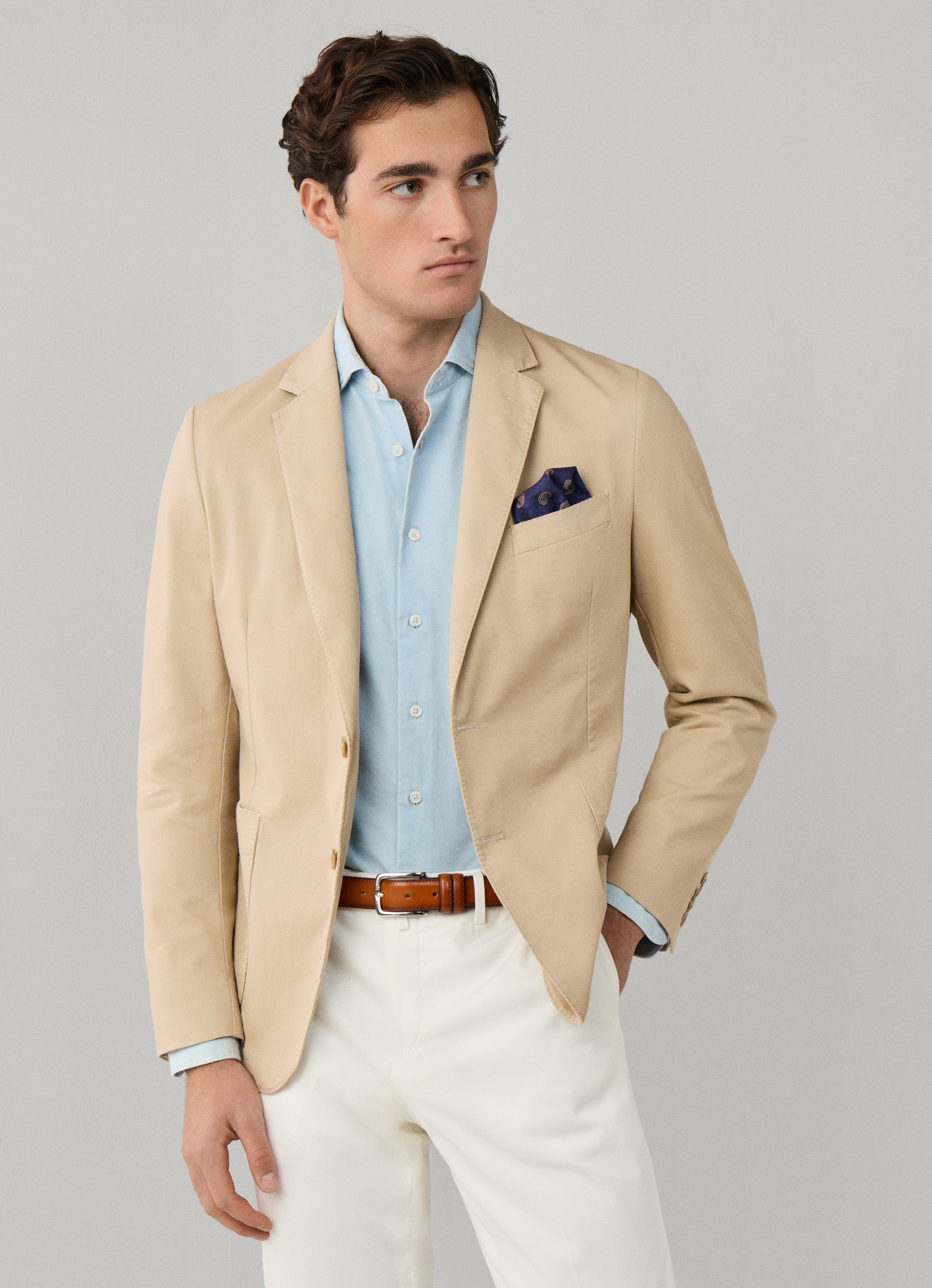 - Unlined, single-breasted two button fastening, notch lapel, patch pockets and closed button cuffs