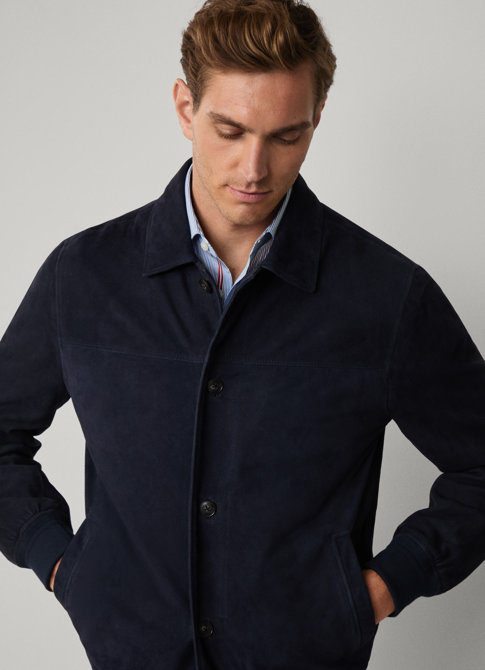 - Features six button front fastening, two front welt pockets, suede shirt collar, cuffs and hem