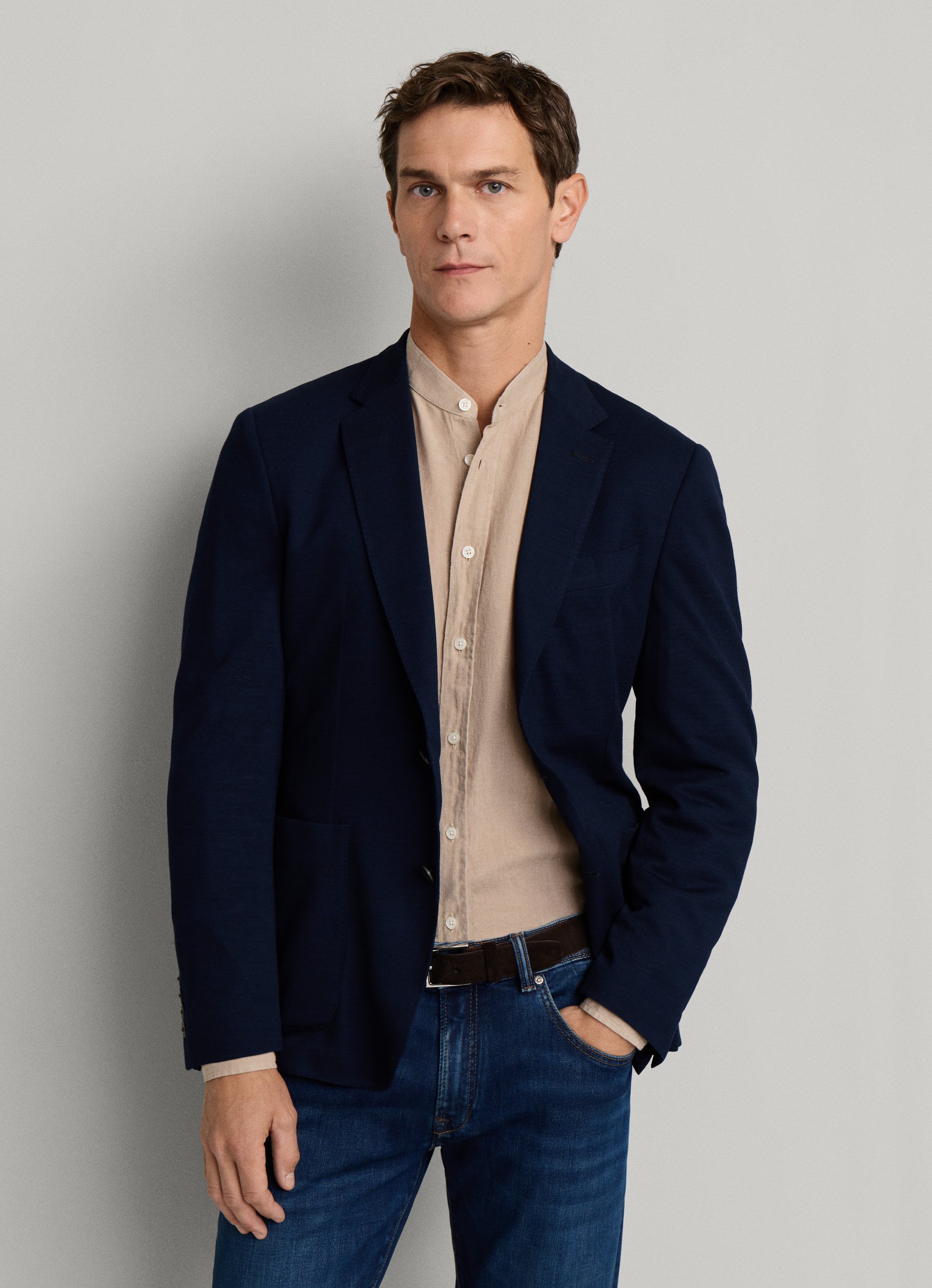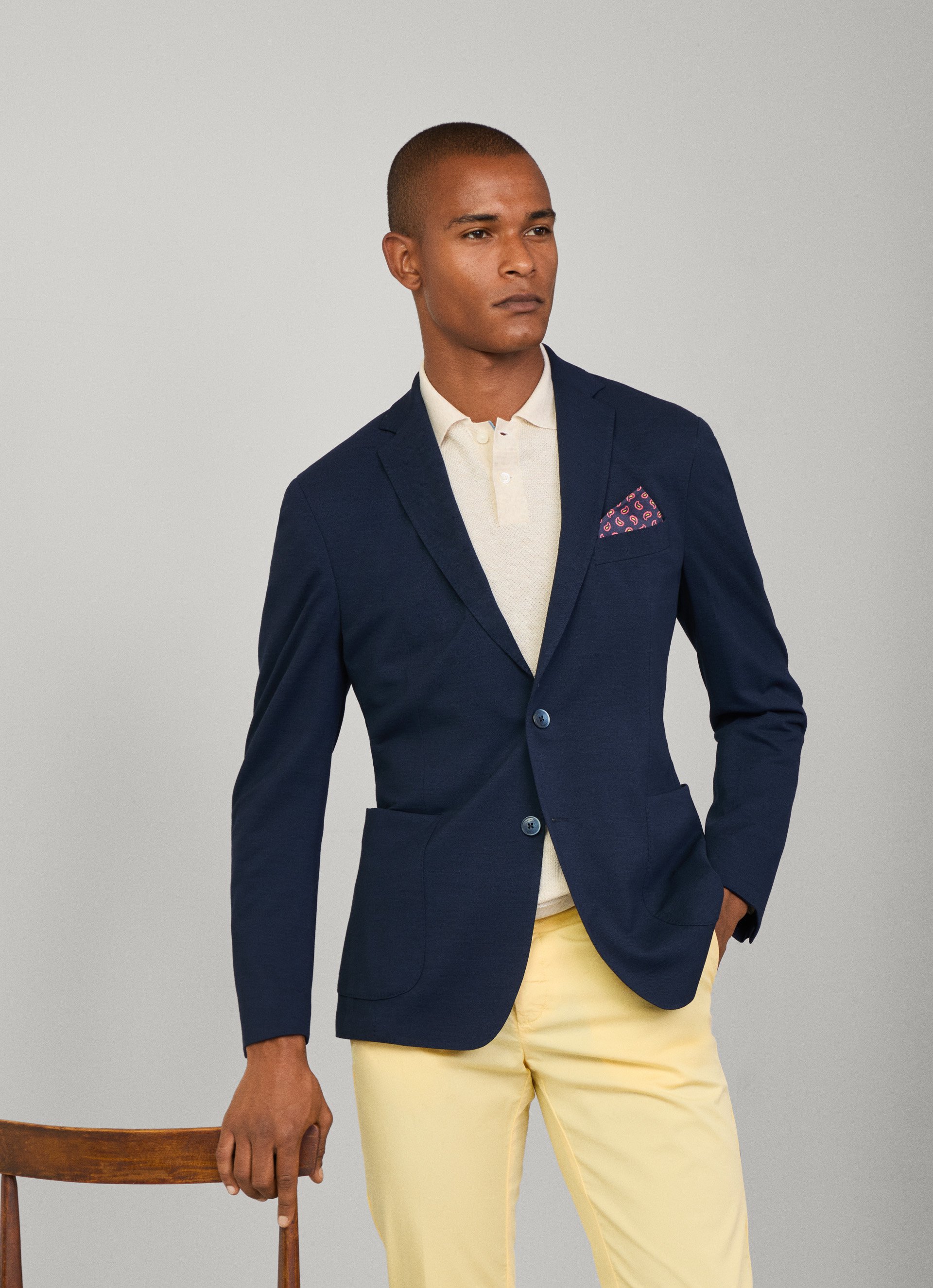 - Features 2 buttons, a notch lapel, button cuffs, and patch pockets for modern tailoring.
