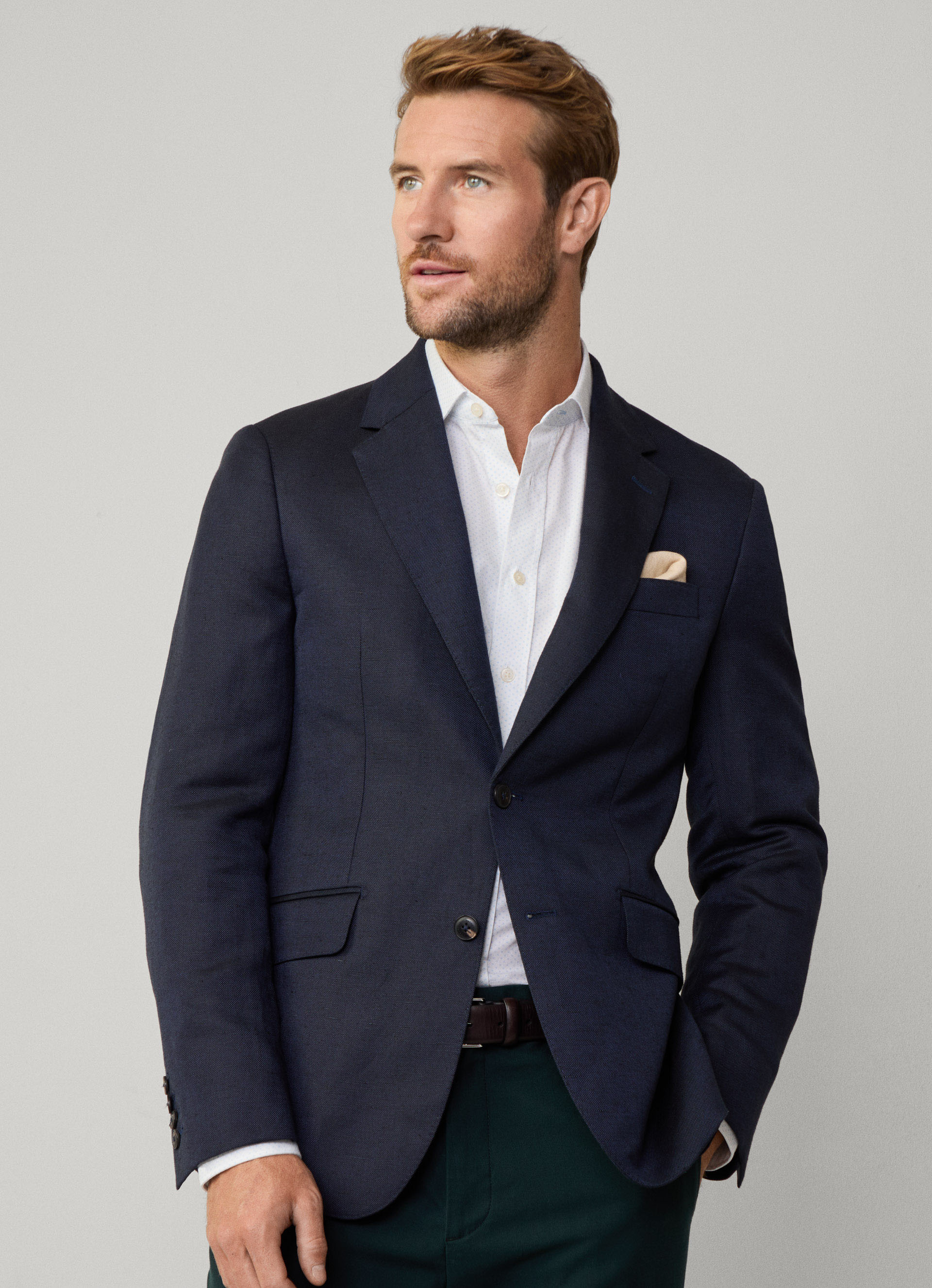- Features two buttons, a notch lapel, button cuffs, and flap pockets