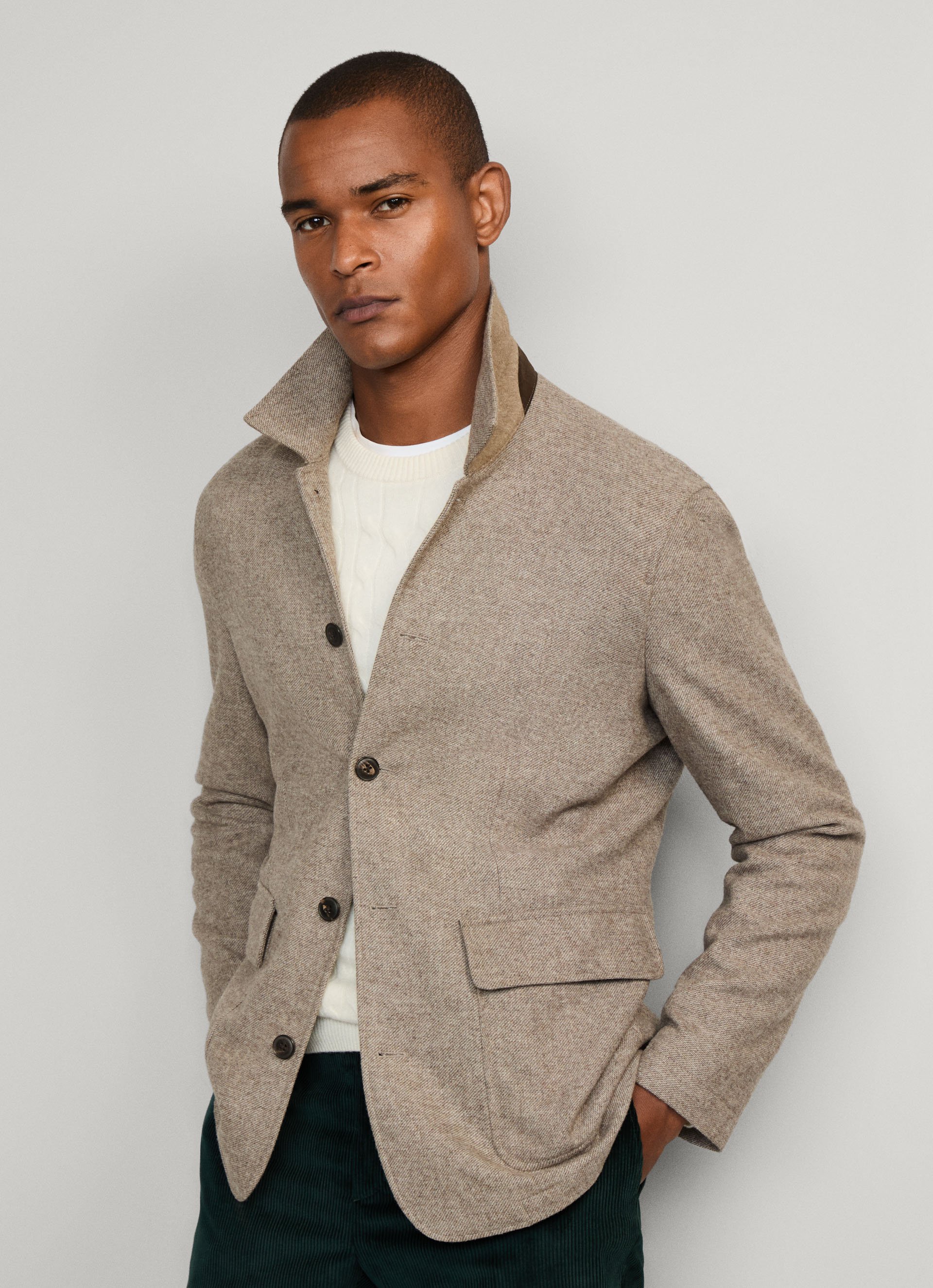 - Features five button fastening and patch pockets with a collar for a modern tailoring silhoutte
