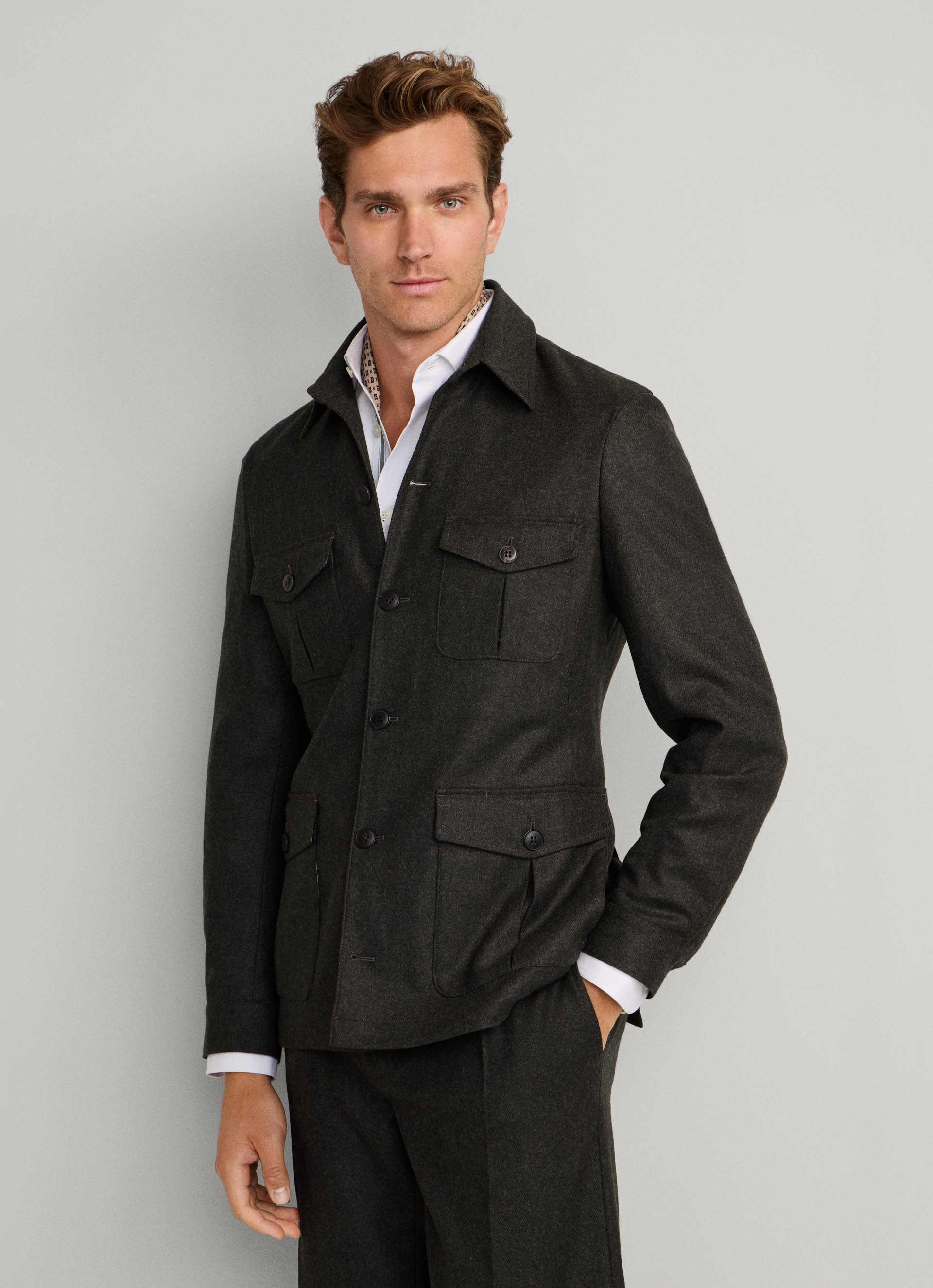 - Wool-cashmere blend fabric with a classic toanl herringbone design and fully-unlined internals