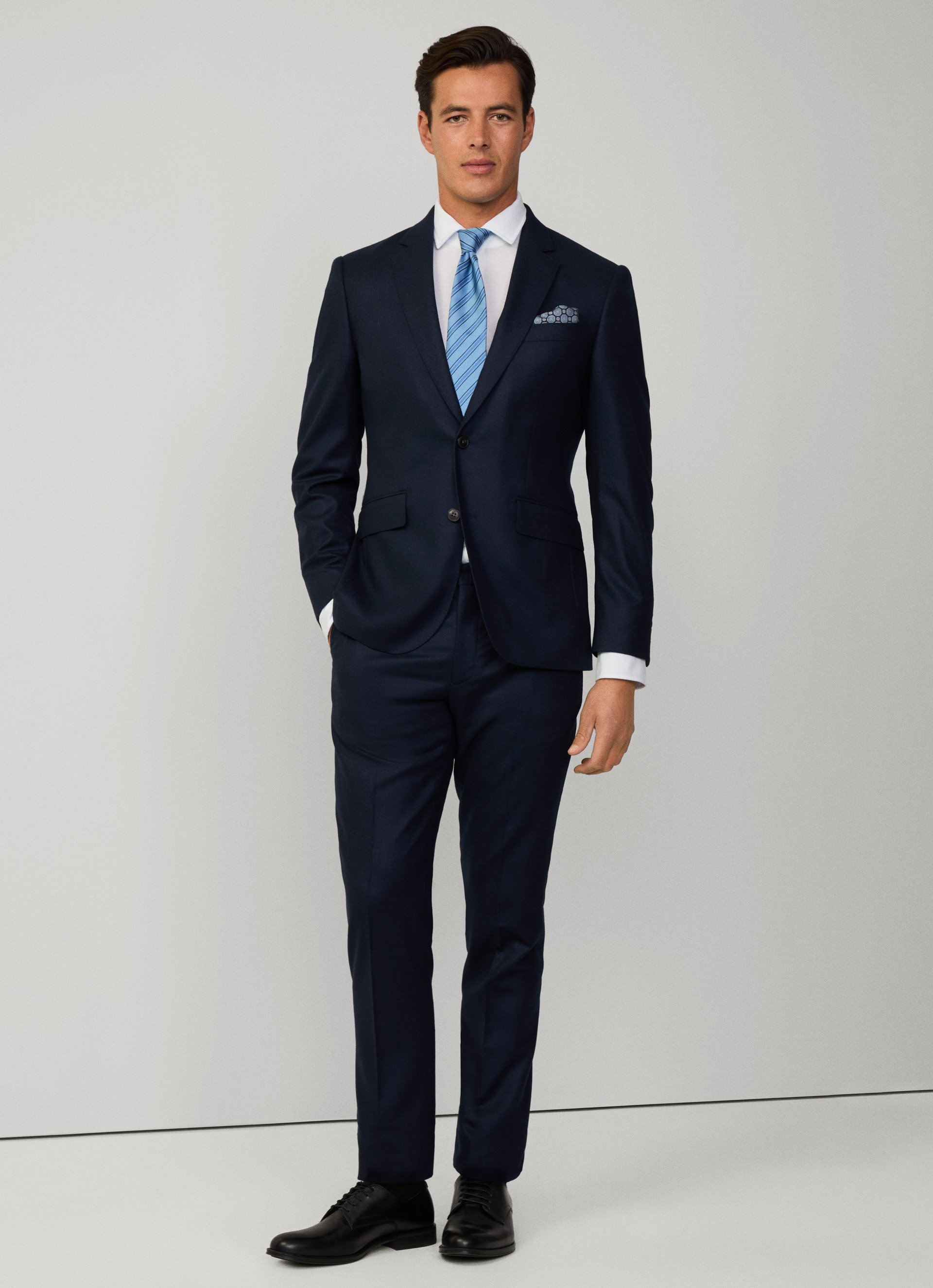 - Features two button, a notch lapel, button cuffs, and flap pockets for timeless tailoring